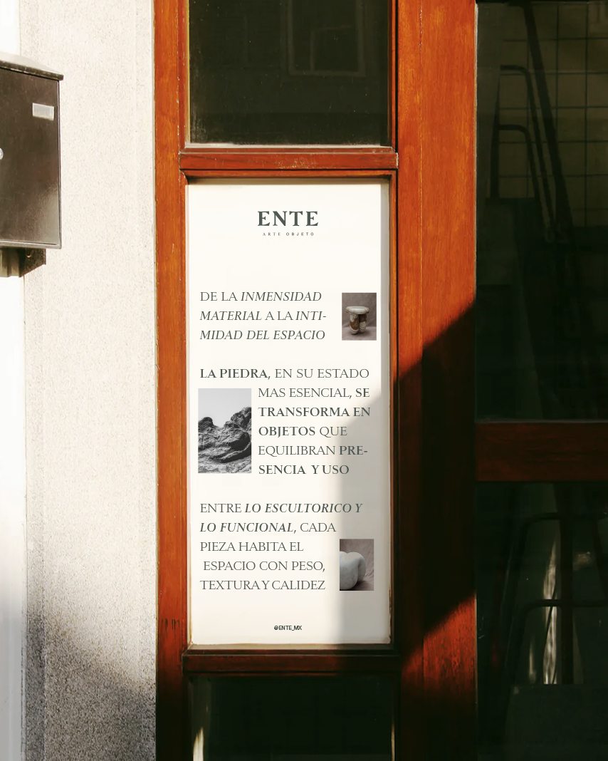 Ente is conceived as a space between object and sculpture, a gallery built around pieces carved from raw stone, where material weight meets an almost intimate dimension.